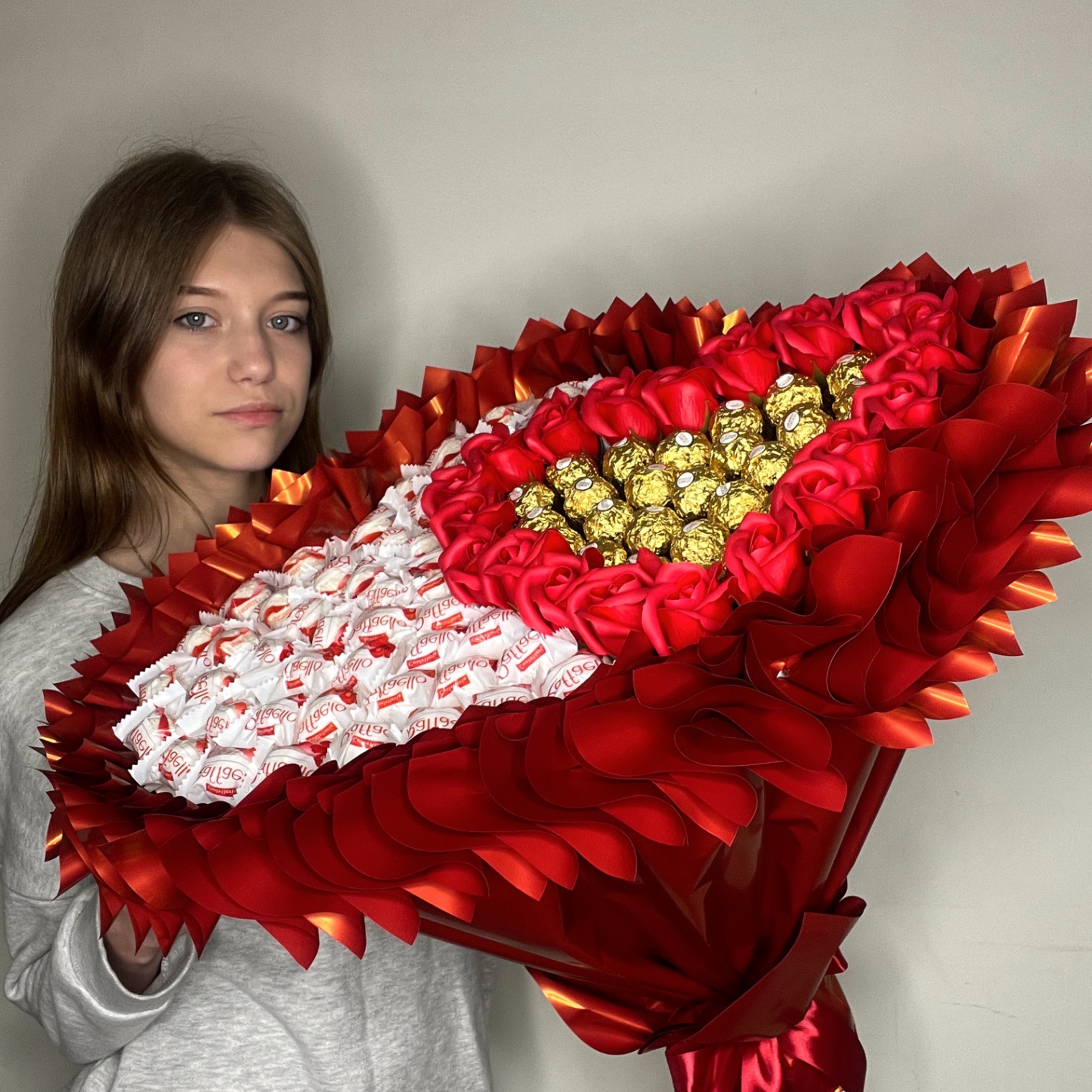 Wyjątkowy bukiet w kształcie podwójnego serca o wymiarach 50×50 cm – najpiękniejsze połączenie dwóch dusz w jednym geście. Delikatne mydlane róże tworzą dwa splecione serca w subtelnej kolorystyce, a przestrzeń między nimi wypełniają luksusowe pralinki Ferrero Rocher i kremowe Raffaello. Ta romantyczna i bardzo słodka kompozycja jest idealna na zaręczyny, rocznicę ślubu, walentynki lub po prostu wtedy, gdy chcesz powiedzieć „kocham Cię” w najbardziej efektowny sposób.