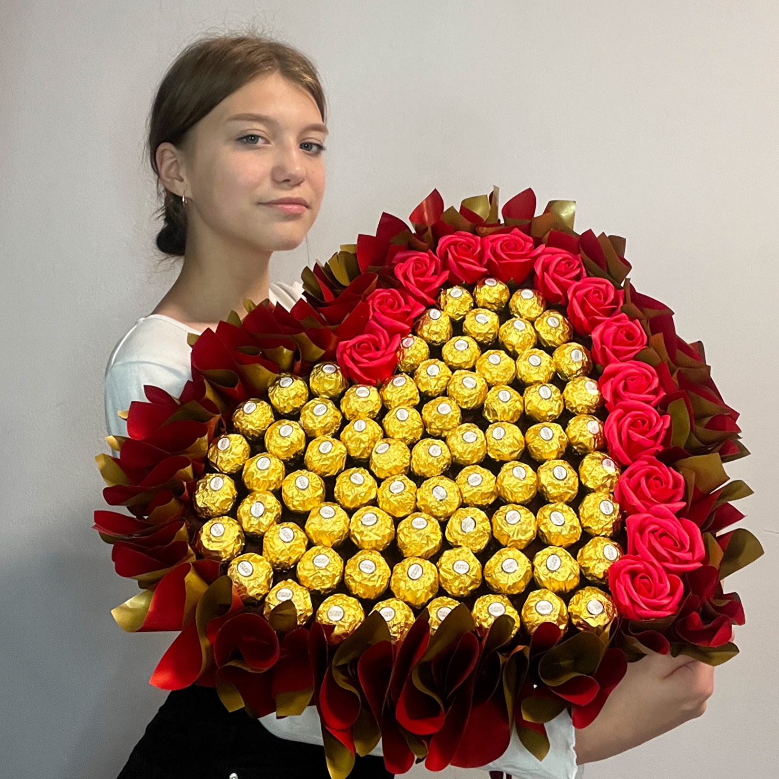 Wnętrze kompozycji wypełniają ekskluzywne pralinki Ferrero Rocher, nadające całości głębi i luksusowego charakteru.