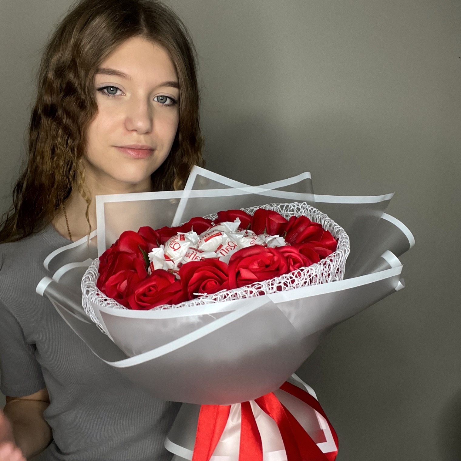 Subtelny bukiet z delikatnymi pralinkami Raffaello w środku, idealny jako elegancki prezent.