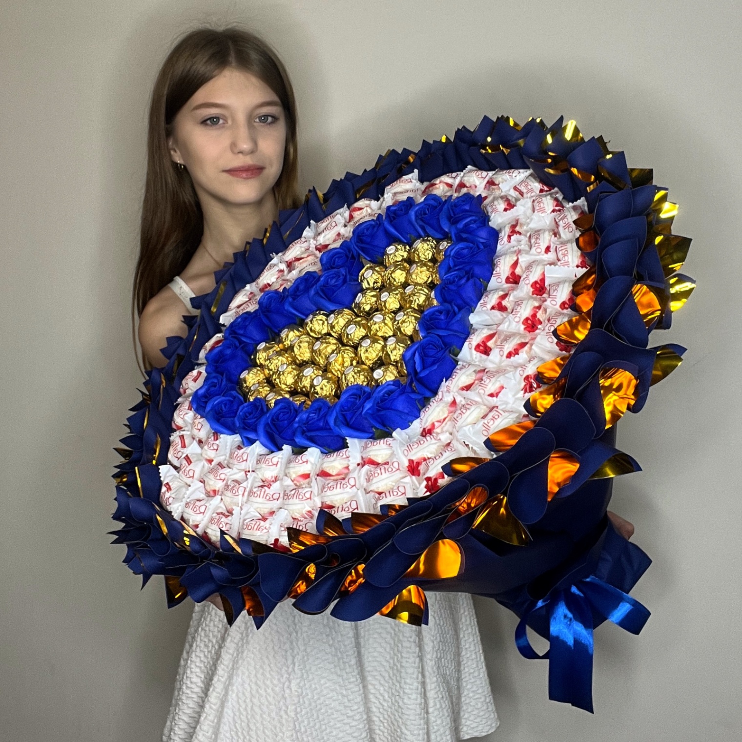 Ekskluzywny bukiet o wymiarach 50×50 cm – wyjątkowe połączenie elegancji i słodyczy. Delikatne mydlane róże w intensywnie niebieskiej oprawie uzupełnione są pralinkami Raffaello i Ferrero Rocher. Idealny na wyjątkowe okazje lub jako niezapomniany gest pełen uroku.