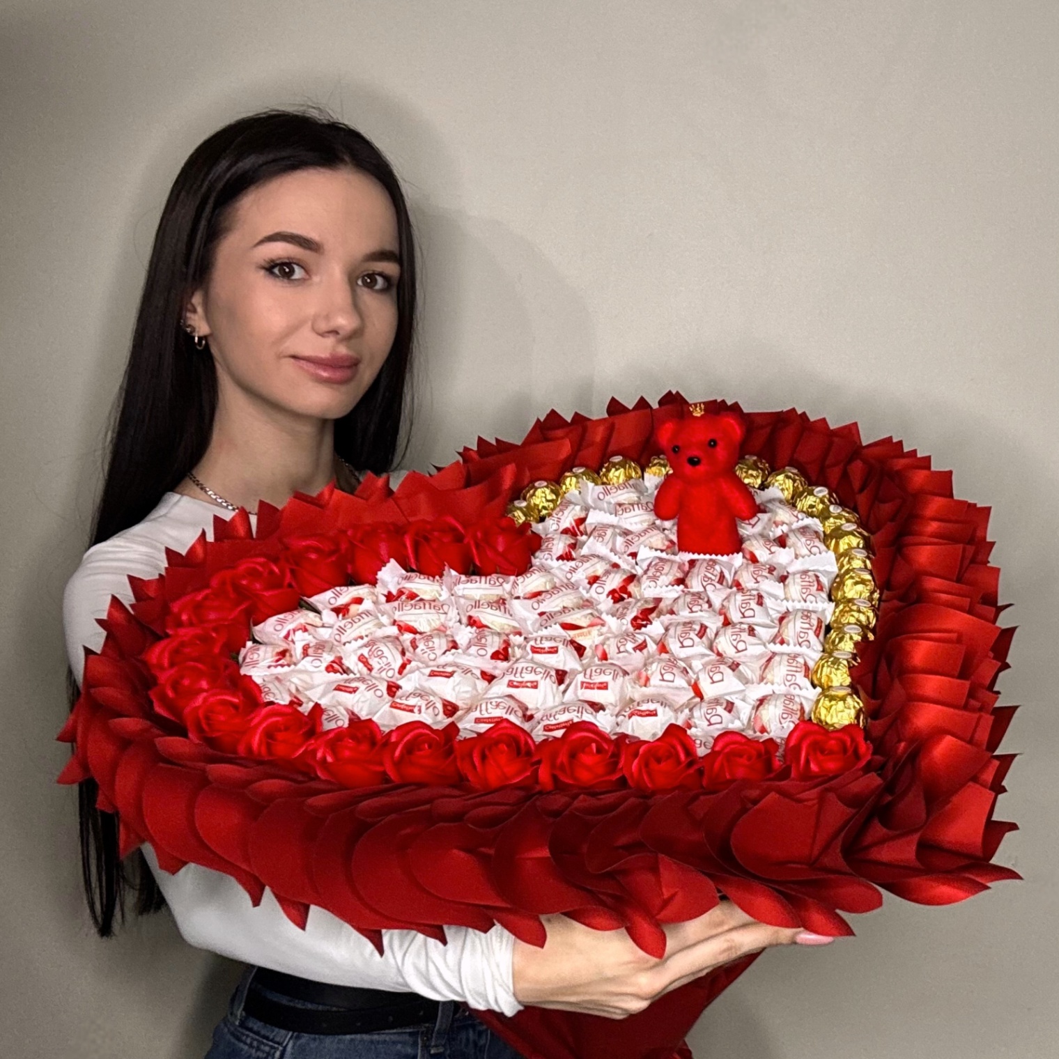 Duży. Efektowny. Pełen emocji. Kompozycja o średnicy 50 cm to prezent, którego nie da się przeoczyć. Intensywna czerwień, słodkie wnętrze i eleganckie detale tworzą prawdziwie luksusową całość. W centrum znajdują się delikatne pralinki Raffaello oraz uroczy mały czerwony miś. Z jednej strony kompozycję zdobi rant z czerwonych róż mydlanych, z drugiej — złote pralinki Ferrero Rocher. Idealne połączenie romantyzmu i elegancji.