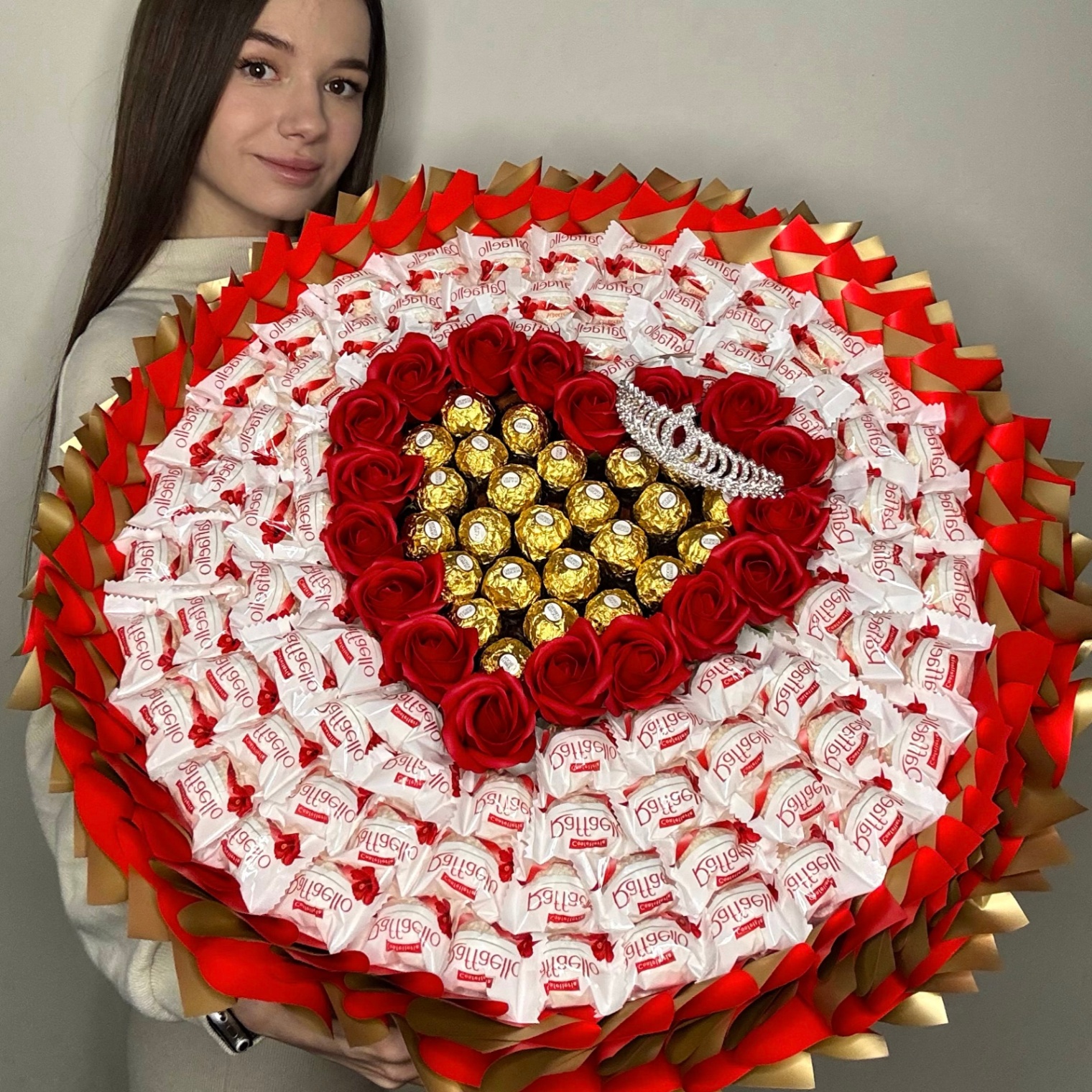Luksusowa kompozycja o wymiarach 50×50 cm w idealnym, okrągłym kształcie, w całości wykonana z pralin Raffaello, które nadają jej lekkości i elegancji. W centrum znajduje się czerwone serce z róż, wypełnione pralinkami Ferrero Rocher, a całość dopełnia dekoracyjna korona podkreślająca wyjątkowy, królewski charakter kompozycji. Czerwono-złote opakowanie wzmacnia efekt premium i sprawia, że bukiet prezentuje się niezwykle efektownie. To idealny wybór na wyznanie miłości, rocznicę, zaręczyny lub prezent, który ma zrobić ogromne wrażenie. 50 cm czystego luksusu i efektu „wow”.
