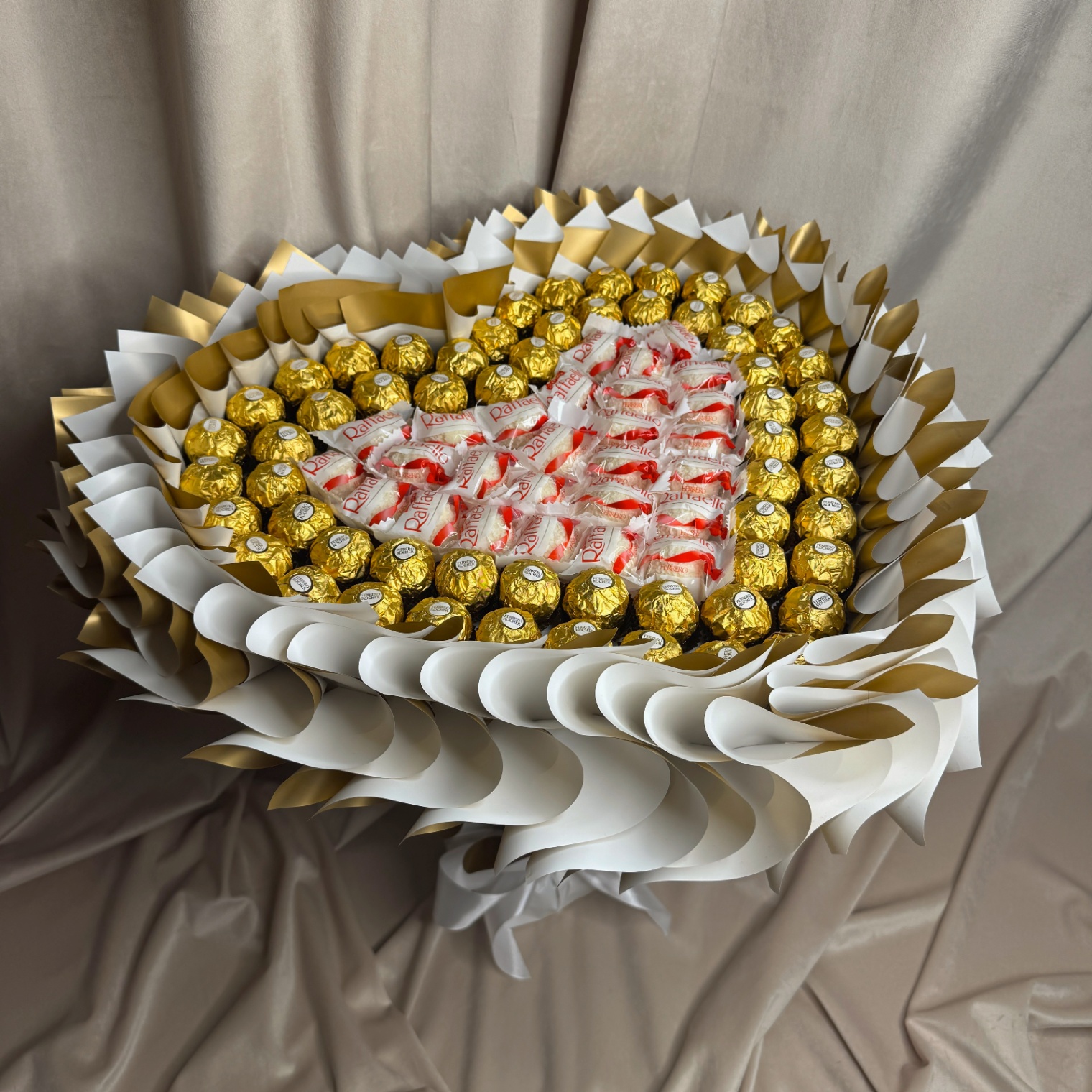 Wyjątkowy bukiet w kształcie serca, zapakowany w elegancką białą i złotą folię, który zachwyca zarówno wyglądem, jak i smakiem.