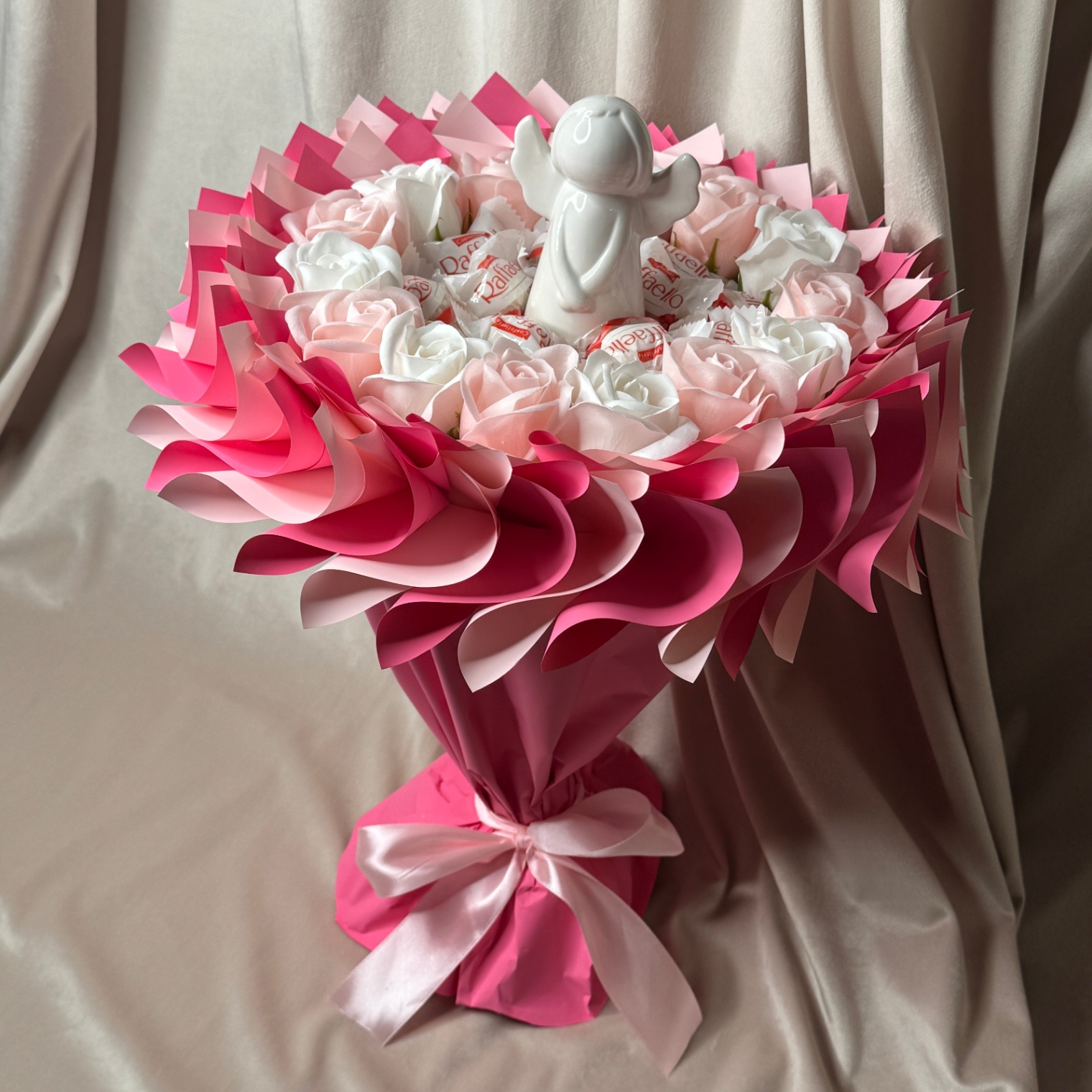 Delikatny bukiet w różowych odcieniach, stworzony specjalnie na Komunię Świętą dla dziewczynki. Kompozycja łączy eleganckie mydlane róże z pysznymi pralinkami Raffaello, tworząc wyjątkowy i słodki prezent. Bukiet wygląda bardzo subtelnie i elegancko, dlatego idealnie podkreśla uroczysty charakter tego wyjątkowego dnia. To piękna pamiątka oraz oryginalny sposób na złożenie życzeń. Idealny prezent na Komunię Świętą dla córki, chrześnicy lub wnuczki.