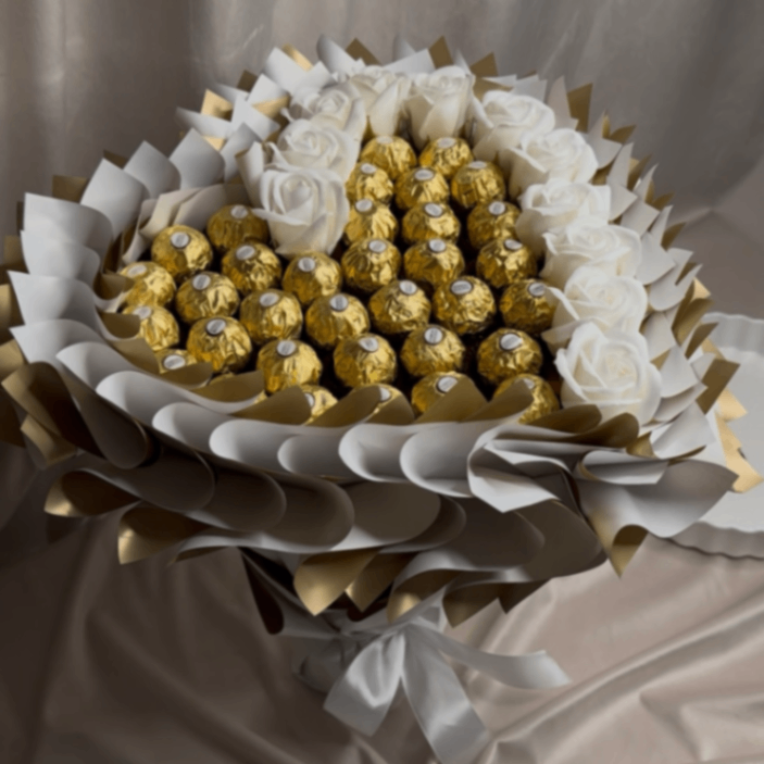 Luksus, który mówi bez słów. Ekskluzywna kompozycja z białych róż oraz czekoladek Ferrero Rocher, zapakowana w efektowne, wielowarstwowe opakowanie z eleganckimi złotymi akcentami. To propozycja dla osób, które cenią klasę, styl i efekt „wow” od pierwszego spojrzenia. Białe róże symbolizują szczerość i czystość uczuć, a złote czekoladki dodają całości prestiżu i wyjątkowego charakteru. Idealne połączenie estetyki i słodkiej przyjemności.