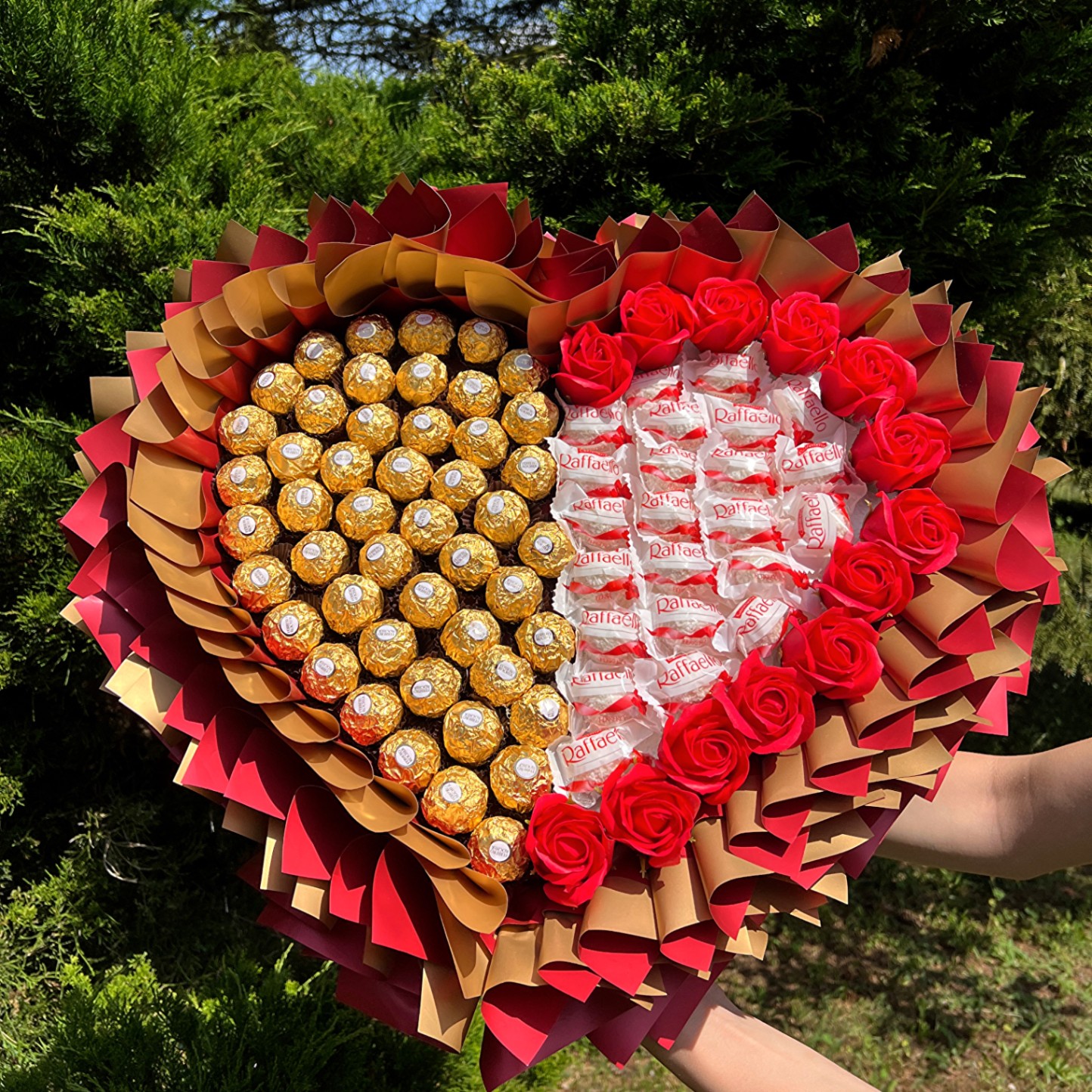 Romantyczny bukiet w kształcie serca o wymiarach 45×45 cm, który zachwyca harmonijnym połączeniem słodyczy i elegancji. Kompozycja składa się z połówek pralinek Raffaello i Ferrero Rocher, tworząc oryginalną mozaikę pełną smaku i uroku. Idealny na walentynki, rocznice lub jako wyraz uczuć, ten unikalny prezent rozświetli każdą specjalną chwilę.
