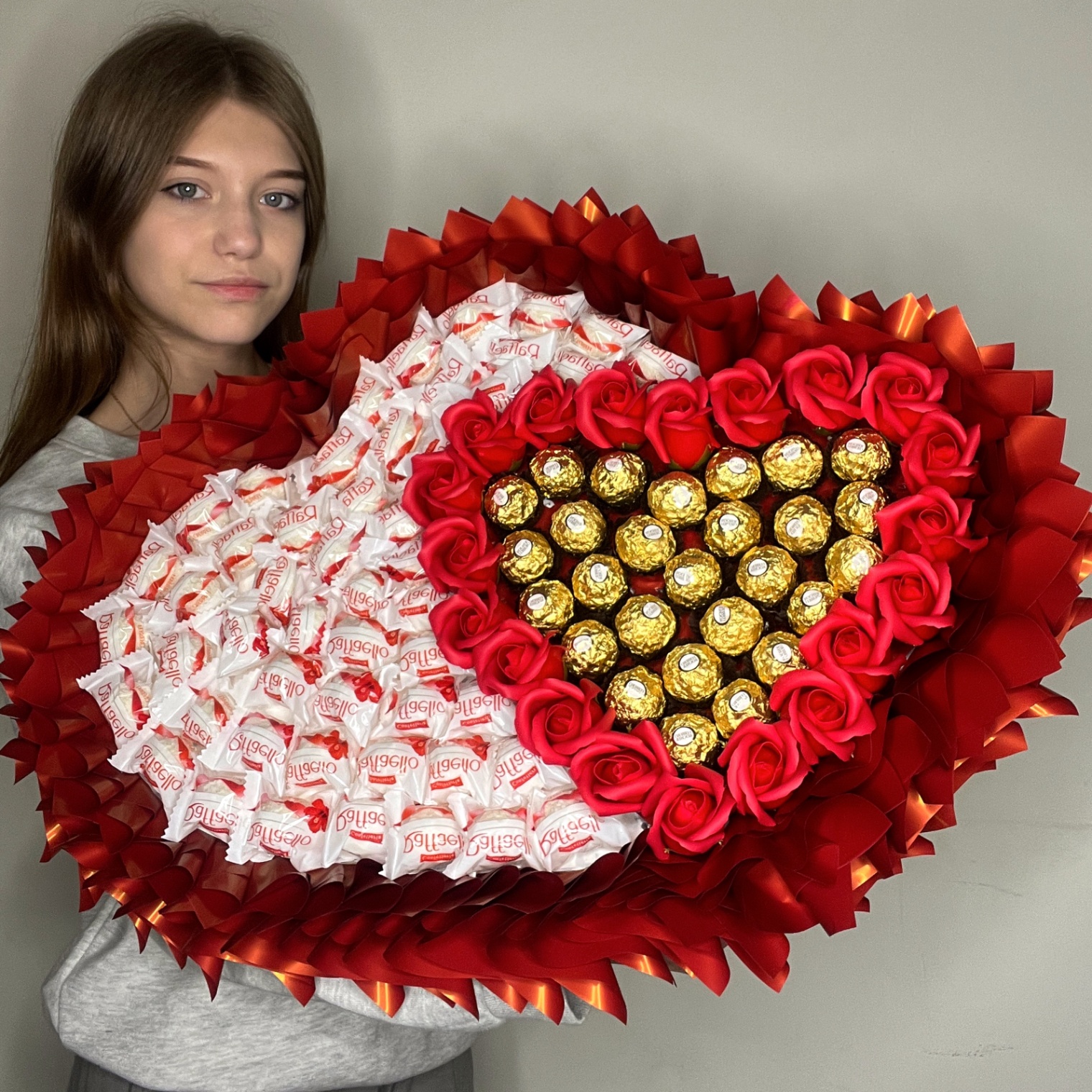 Wyjątkowy bukiet w kształcie podwójnego serca o wymiarach 50×50 cm – najpiękniejsze połączenie dwóch dusz w jednym geście. Delikatne mydlane róże tworzą dwa splecione serca w subtelnej kolorystyce, a przestrzeń między nimi wypełniają luksusowe pralinki Ferrero Rocher i kremowe Raffaello. Ta romantyczna i bardzo słodka kompozycja jest idealna na zaręczyny, rocznicę ślubu, walentynki lub po prostu wtedy, gdy chcesz powiedzieć „kocham Cię” w najbardziej efektowny sposób.