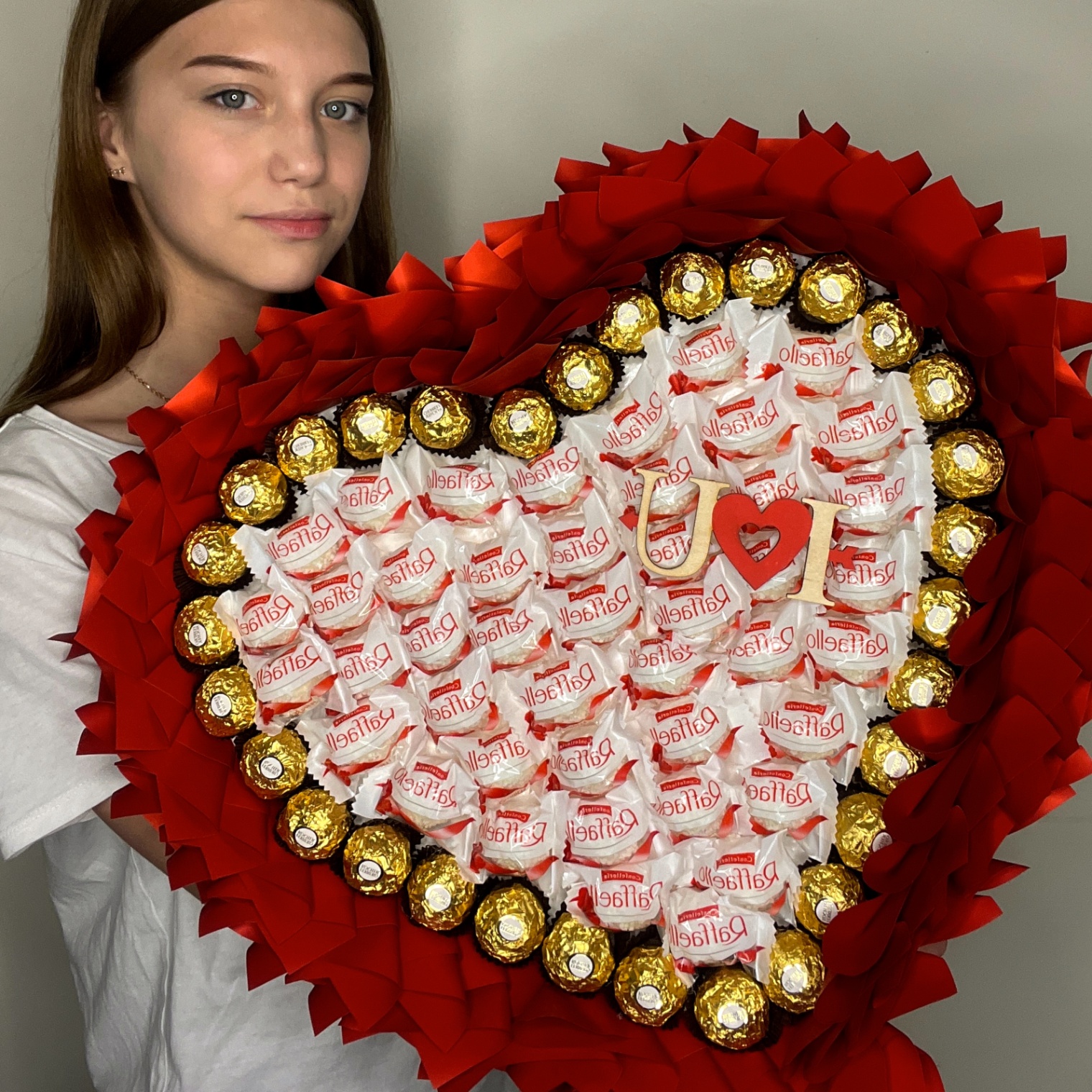 Efektowny bukiet w kształcie serca o wymiarach 45×45 cm w intensywnej czerwonej oprawie – prawdziwy symbol namiętności i luksusowej słodyczy. Cały obwód wypełniają złociste pralinki Ferrero Rocher, tworząc efektowną, błyszczącą ramkę, a wnętrze bukietu wypełniają kremowe, kokosowe Raffaello. Ta dramatyczna, bardzo elegancka i jednocześnie bardzo apetyczna kompozycja idealnie pasuje na walentynki, zaręczyny, rocznicę lub jako najbardziej efektowny sposób powiedzenia „kocham Cię”.