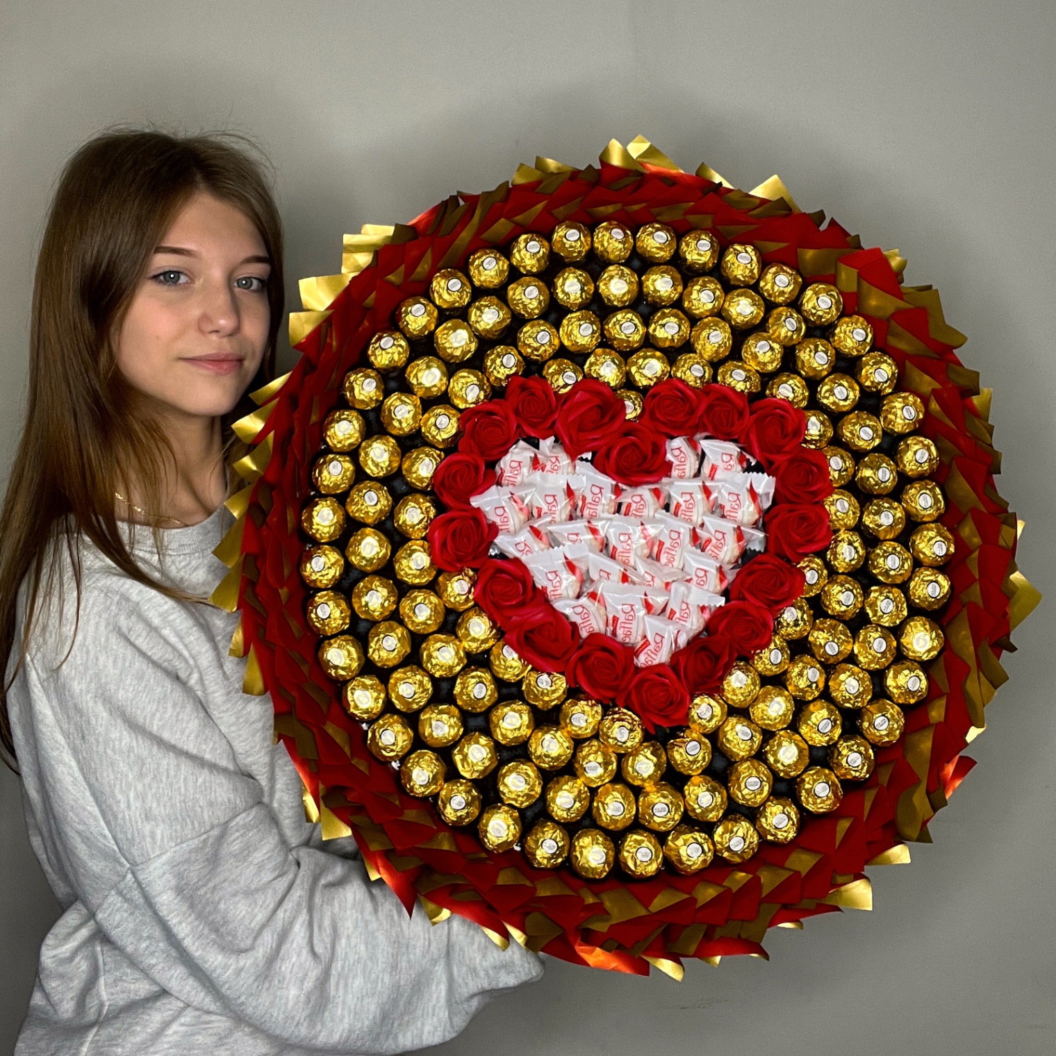 Spektakularny, ogromny bukiet w kształcie serca o imponującej średnicy, w intensywnie czerwono-złotej oprawie – prawdziwa eksplozja luksusu i romantyzmu. Cała powierzchnia wypełniona jest setkami złotych pralinek Ferrero Rocher, tworząc błyszczące, bogate tło. W centralnej części wyłania się duże, wyraźne serce ułożone z czerwonych mydlanych róż i białych pralinek Raffaello w czerwono-białych opakowaniach, które tworzą kontrastowy, bardzo romantyczny akcent. Ta monumentalna, niezwykle efektowna kompozycja to kwintesencja walentynek, zaręczyn, wielkiej rocznicy lub najbardziej „wow” prezentu, jaki można sobie wyobrazić.