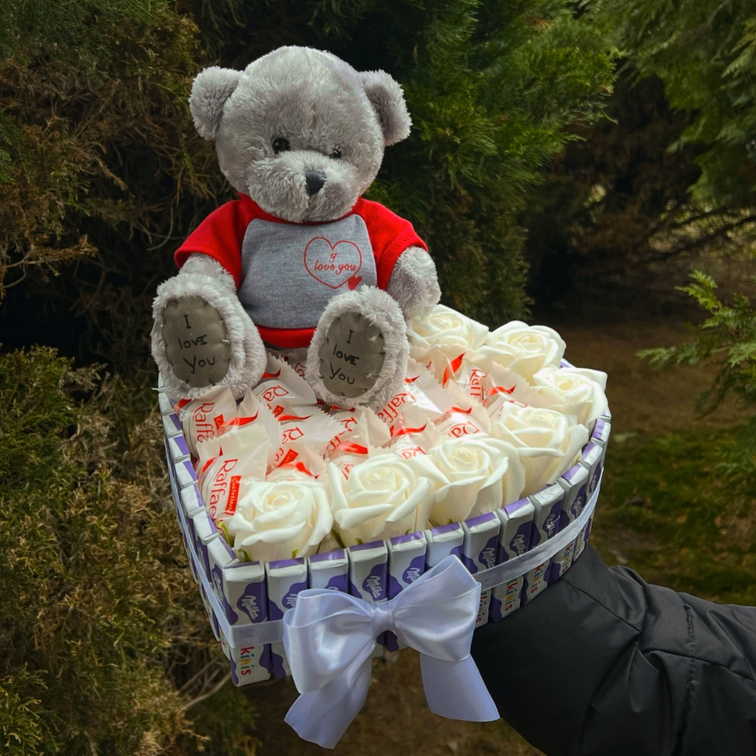 Na górze szary miś w czerwonej bluzce z napisem „I love you”, patrzy na Ciebie i mówi wszystko bez słów.