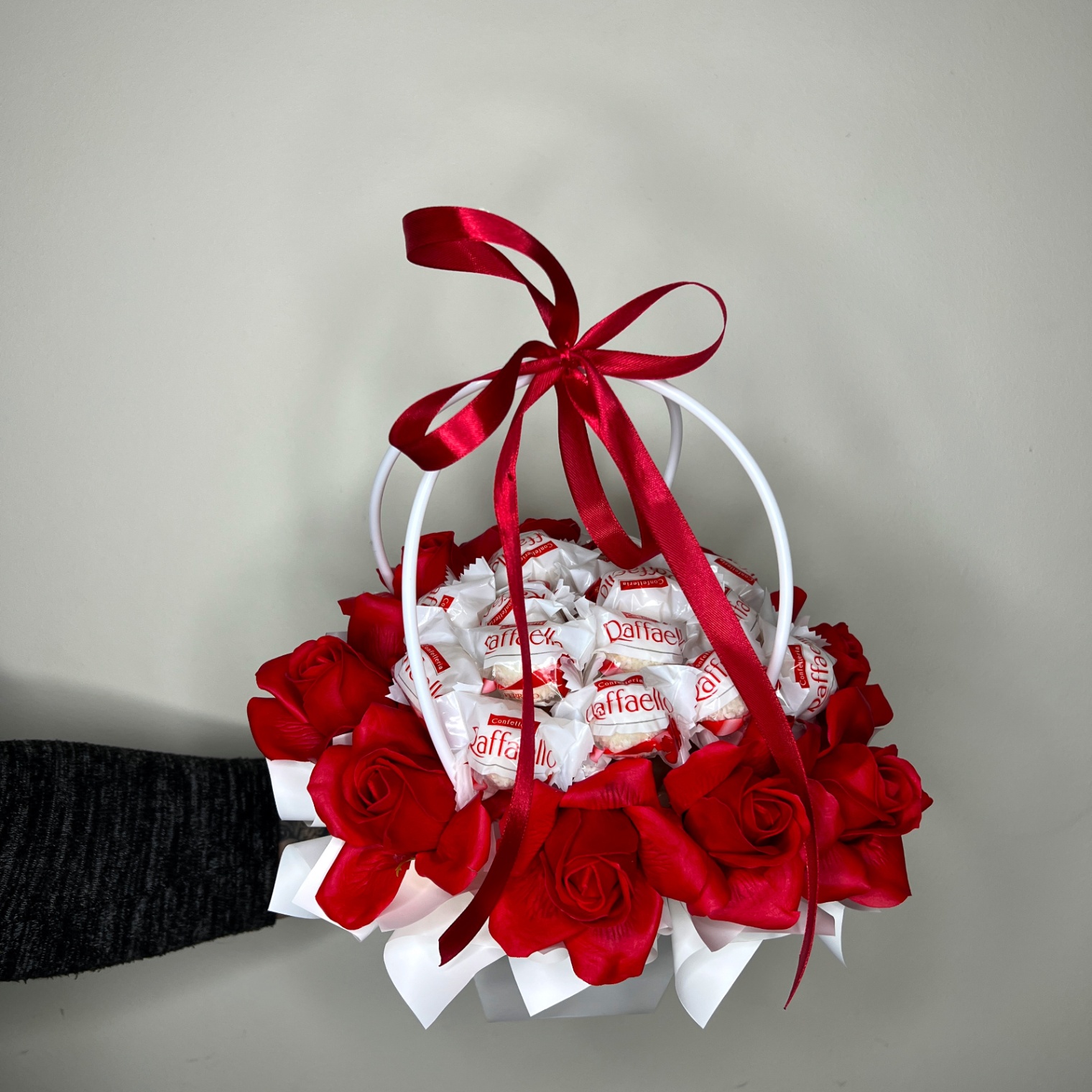 Po bokach – kilka pięknych czerwonych mydlanych róż – głębokie, barwne, aksamitne, pełne pasji i romantyzmu.