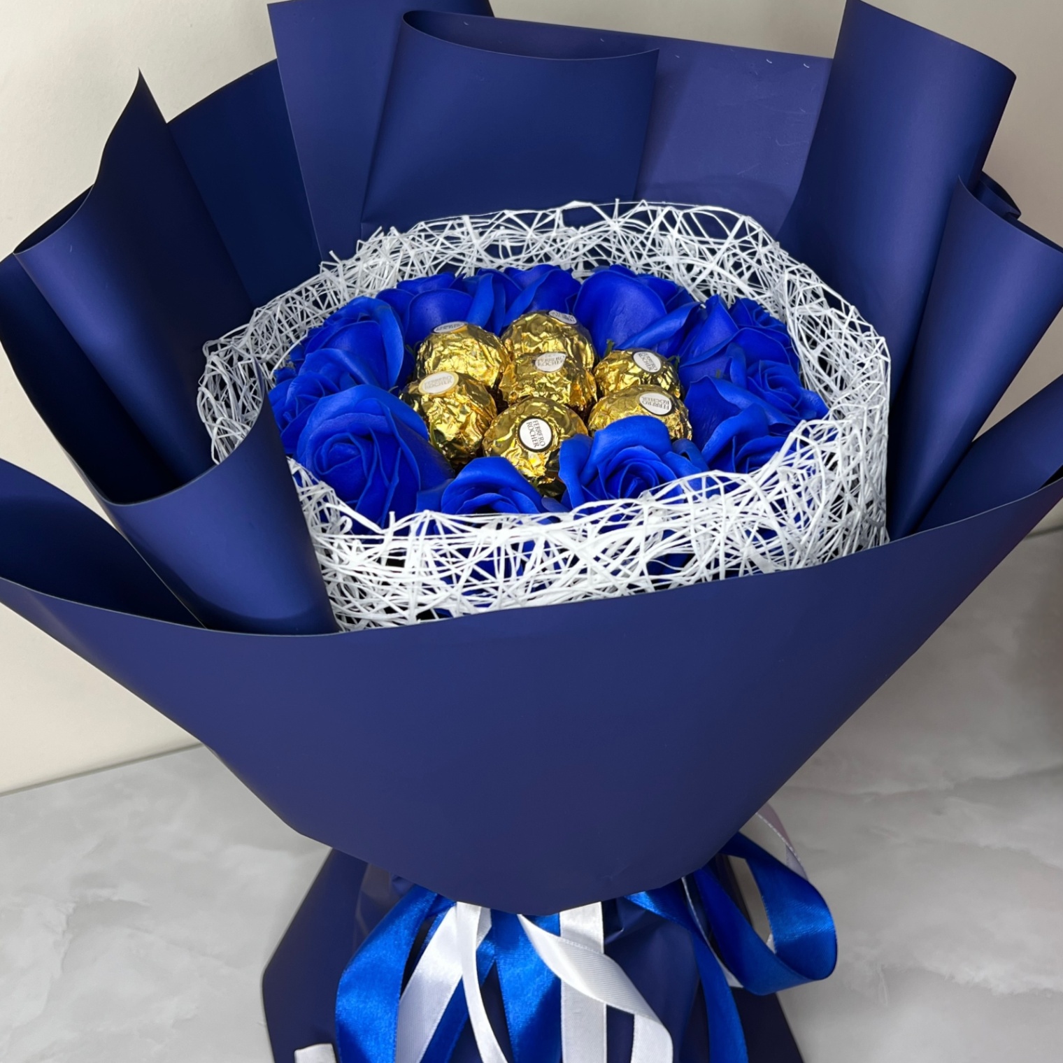 Całość zamknięta w bogatej granatowej oprawie z błękitnymi płatkami i subtelną wstążką – wygląda jak nocne niebo pełne słodyczy i kwiatów.