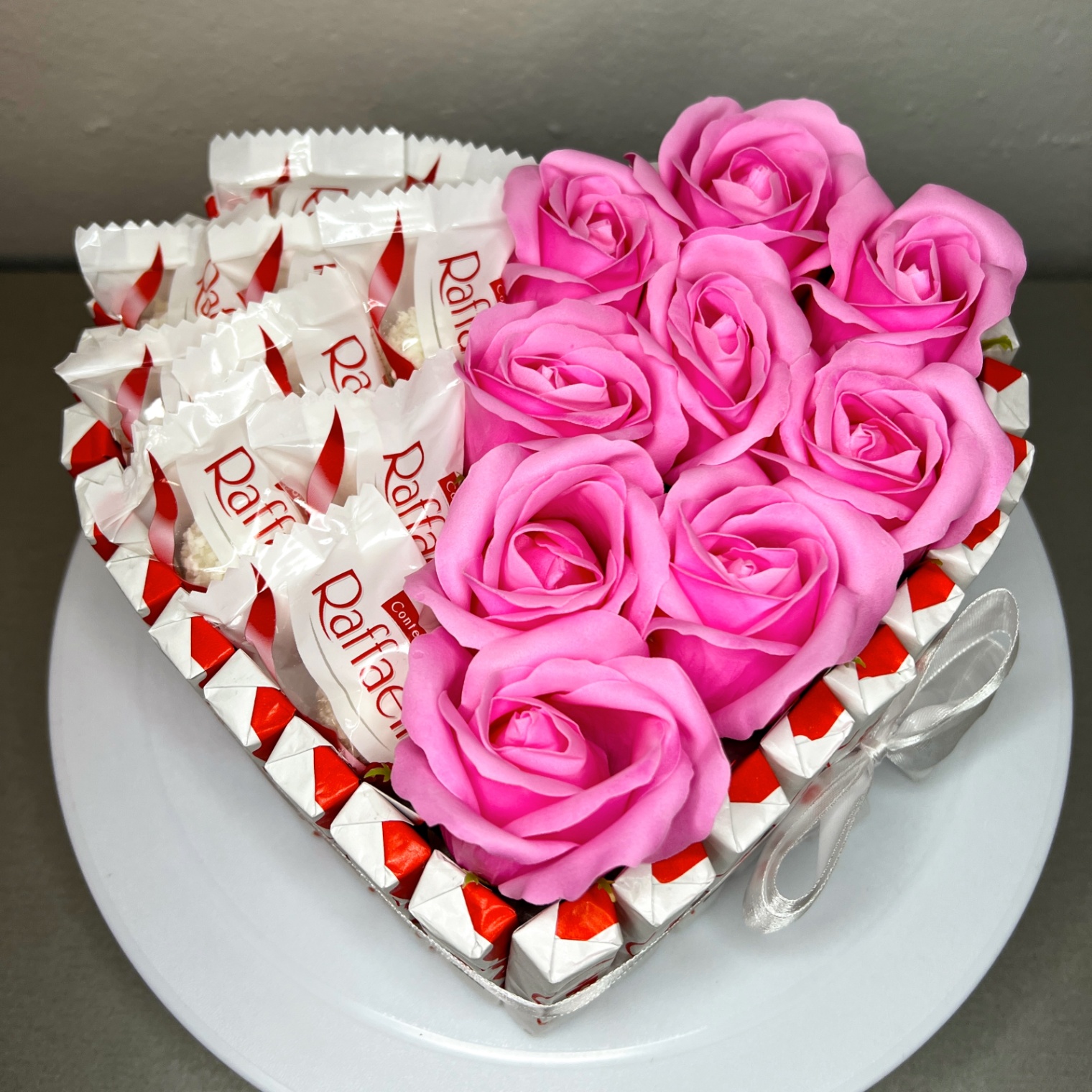 Jedna połowa serca całkowicie wypełniona kremowymi Raffaello – kokosowe kuleczki w czerwono-białych opakowaniach, delikatne, pachnące i rozpływające się w ustach.
