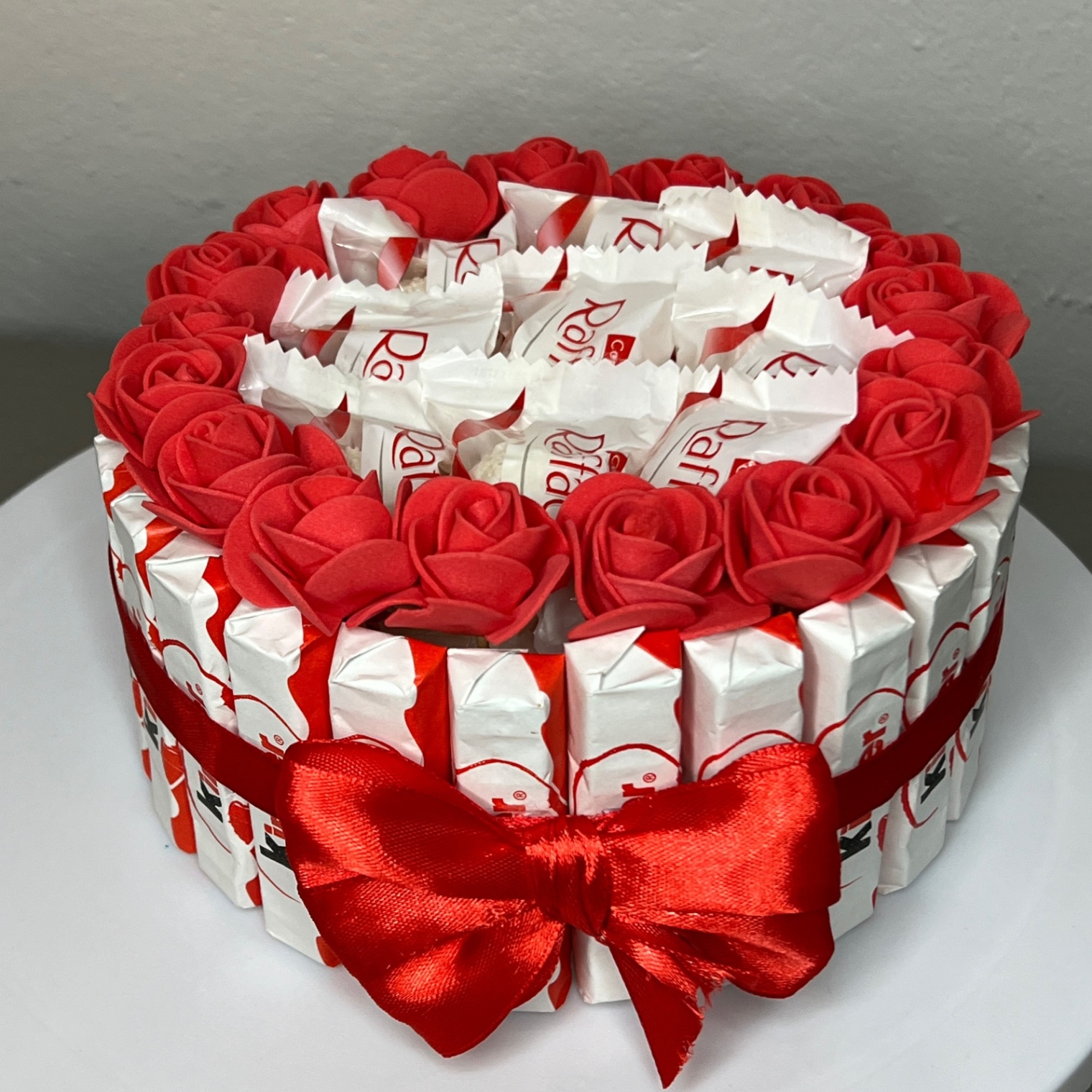 Boki kompozycji zdobią batony Kinder, a wnętrze wypełniają delikatne pralinki Raffaello, nadające całości lekkości i harmonii.