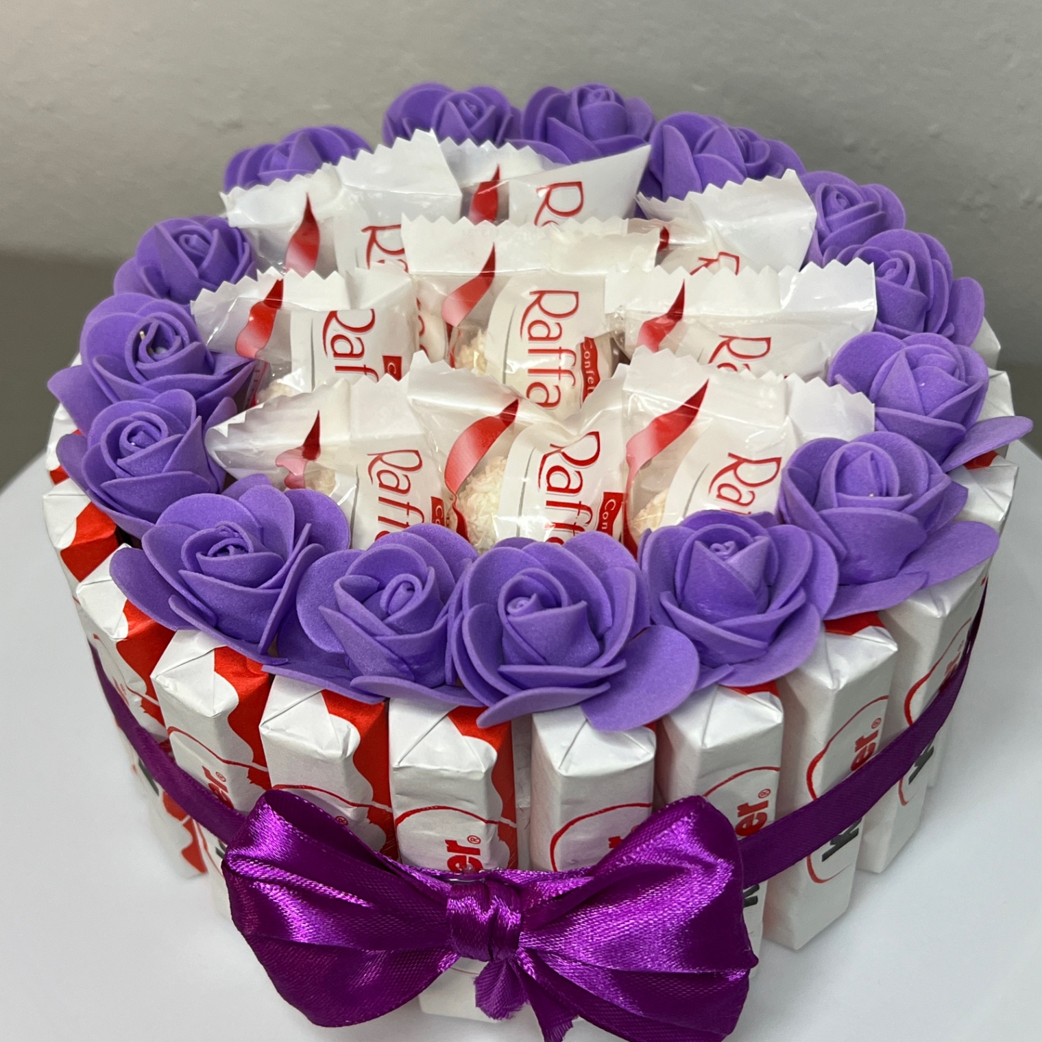 Boki kompozycji zdobią batony Kinder, a wnętrze wypełniają delikatne pralinki Raffaello, dodające subtelnej słodyczy.