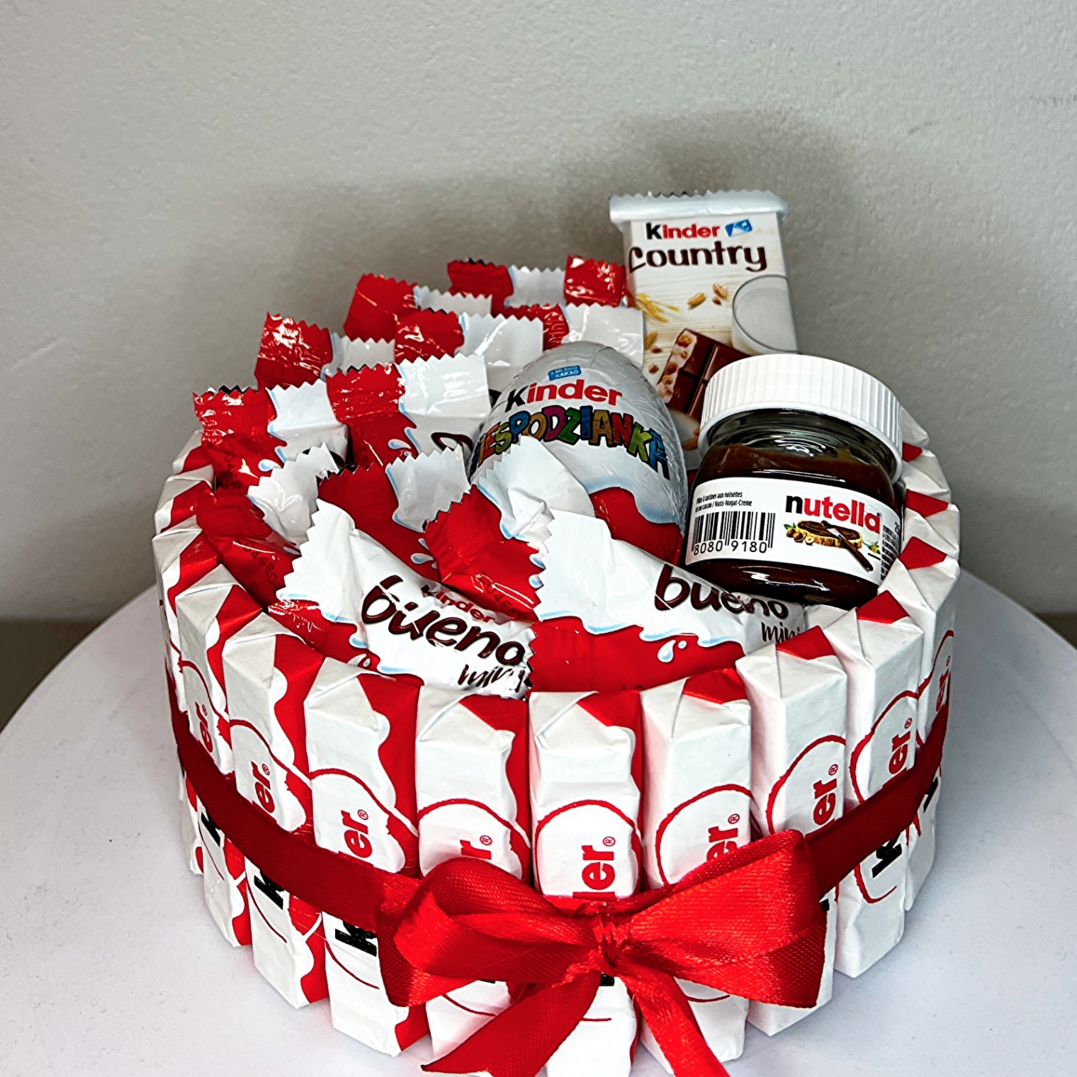 Na wierzchu kompozycja z mini Bueno, Kinder Country, Kinder Niespodzianka oraz mała porcja Nutelli, tworząc eksplozję słodkiego smaku.