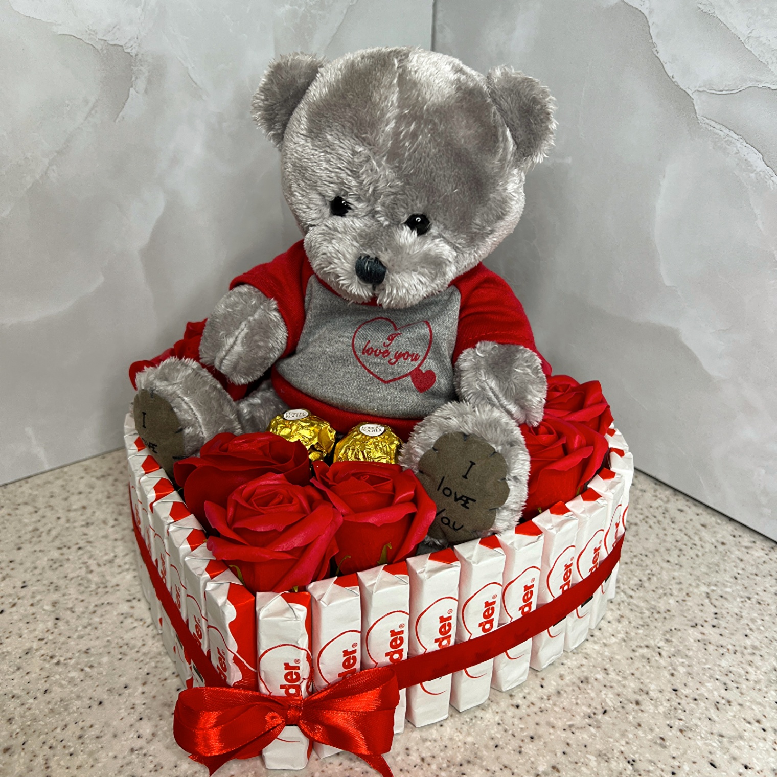 Na wierzchu znajduje się pluszowy miś, kompozycja z miedzianych mydlanych róż oraz ekskluzywne pralinki Ferrero, tworząc idealne połączenie uroku, romantyzmu i słodyczy.