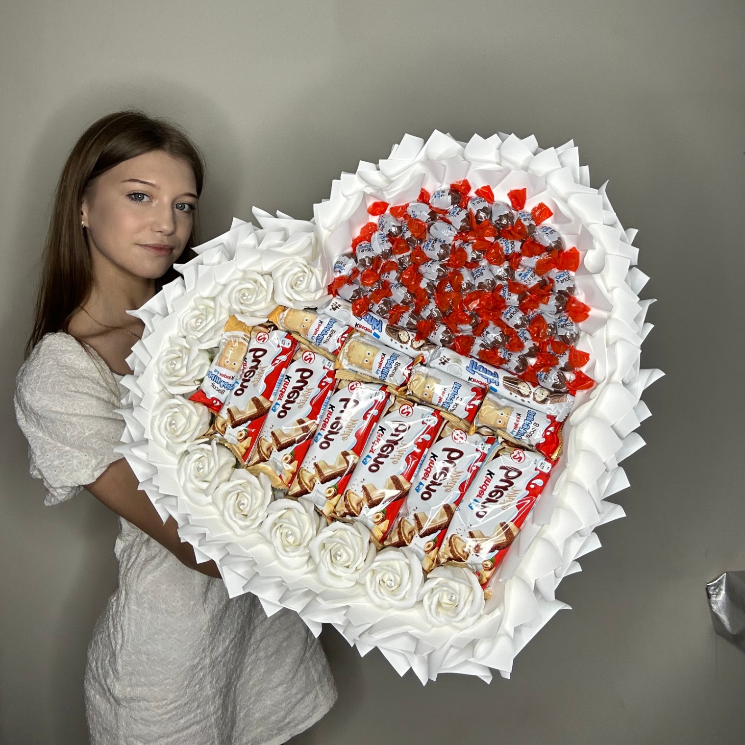 Wnętrze kompozycji wypełniają batoniki Bueno, Kinder Biskvit, Kinder Schoko-Bons i Kinder Trony, tworząc harmonijną i pyszną mieszankę czekoladowych smaków.