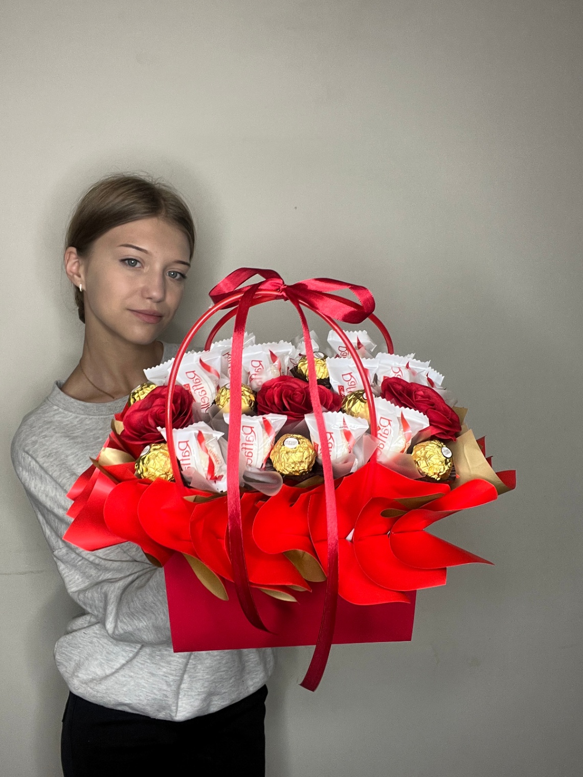 Elegancka czerwona torebka wypełniona słodkimi pralinkami Raffaello i Ferrero, która zachwyca zarówno smakiem, jak i wyglądem.