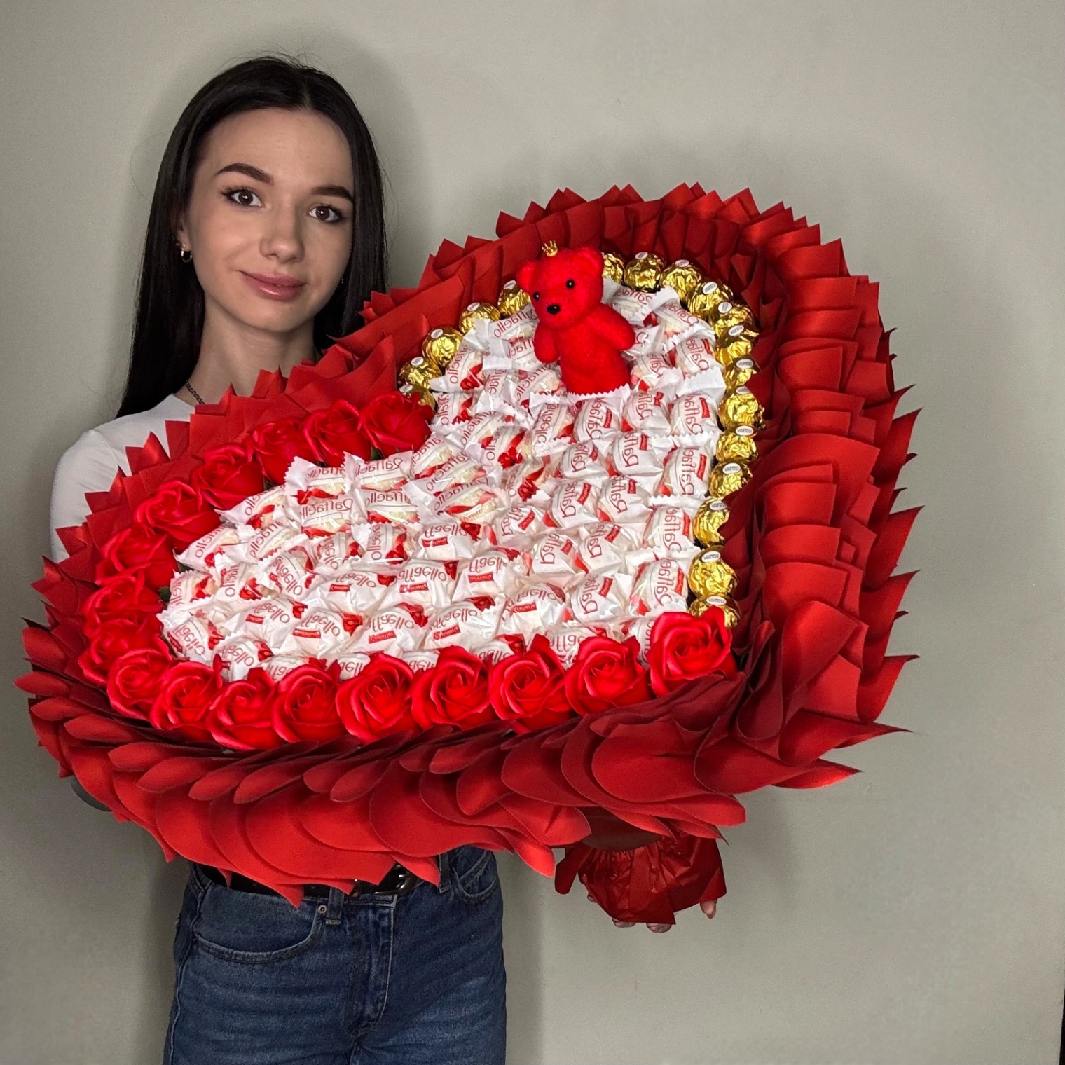 Duży. Efektowny. Pełen emocji. Kompozycja o średnicy 50 cm to prezent, którego nie da się przeoczyć. Intensywna czerwień, słodkie wnętrze i eleganckie detale tworzą prawdziwie luksusową całość. W centrum znajdują się delikatne pralinki Raffaello oraz uroczy mały czerwony miś. Z jednej strony kompozycję zdobi rant z czerwonych róż mydlanych, z drugiej — złote pralinki Ferrero Rocher. Idealne połączenie romantyzmu i elegancji.